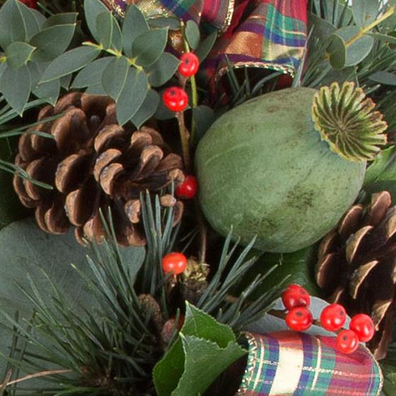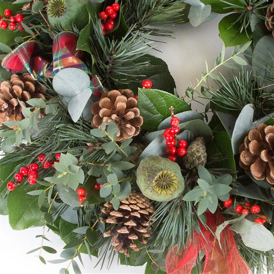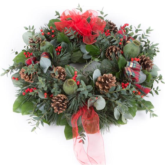 An 18 inch fresh spruce door wreath including ribbon and cones. A perfect, long lasting gift. Please note that two days notice are required when ordering.